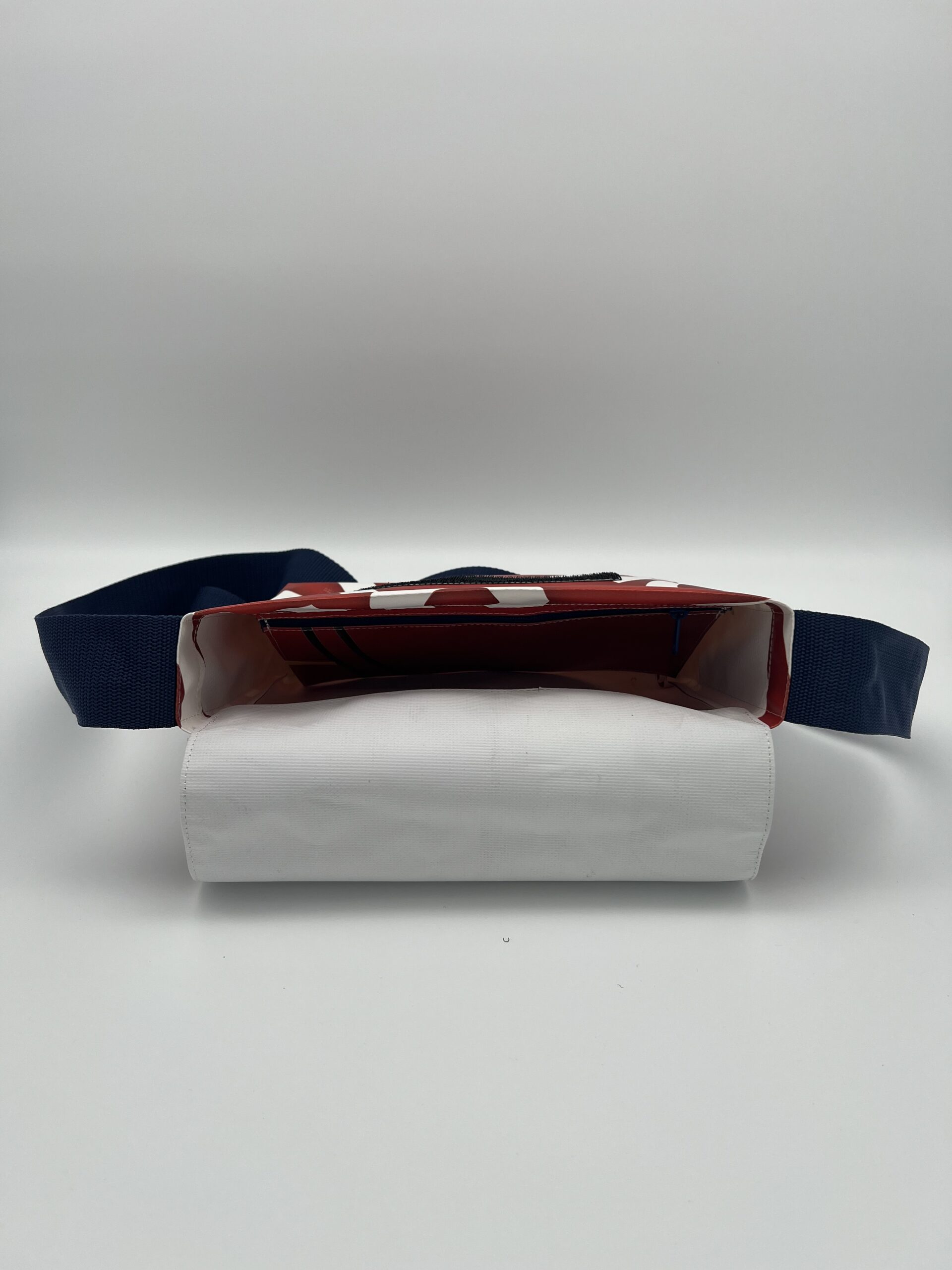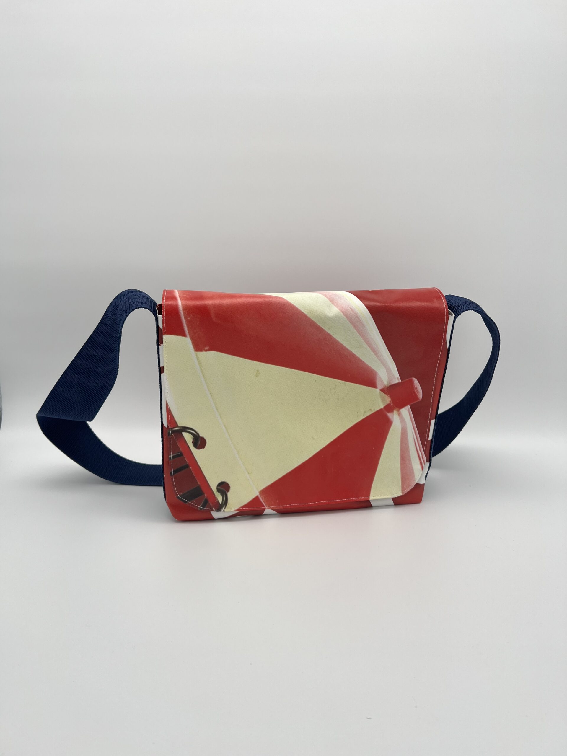 Umhängetasche aus hochwertiger bedruckter PVC-Plane mit Gurtband und Klettverschluss sowie kleiner Innentasche.